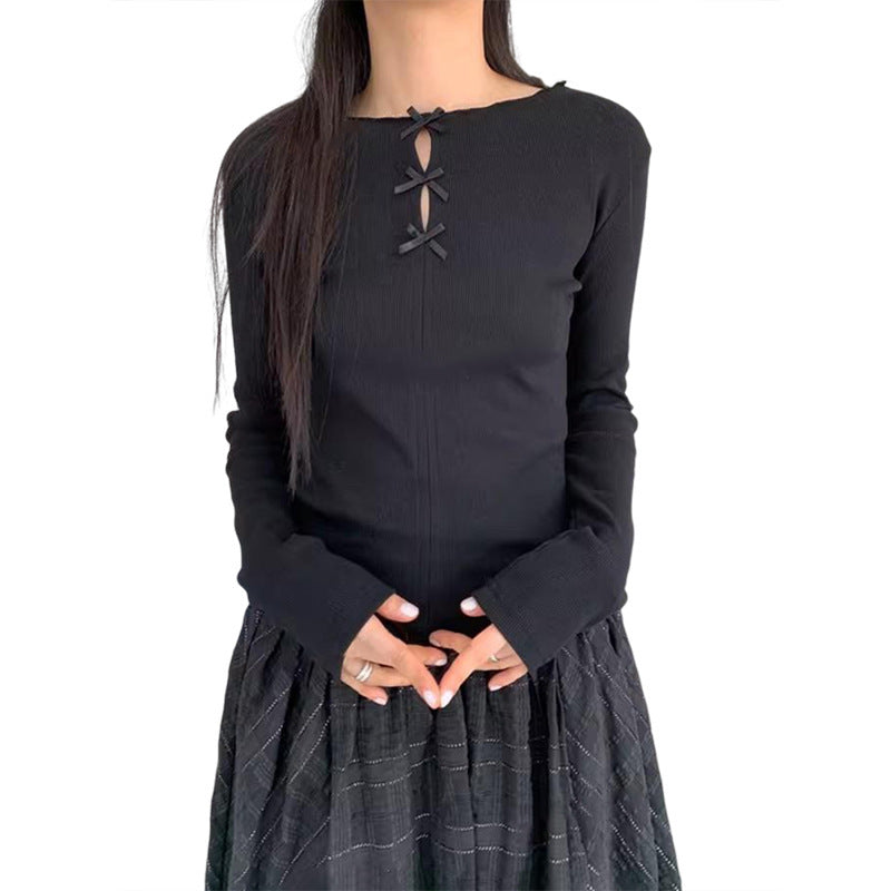Spring New Women’s Solid Color Round Neck Hollow Bow Knitted Top